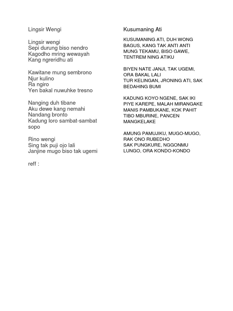 Sebelum selesai ngerjain tugas nonton lingsir wengi #1 dulu. Dikatakan lagu ini adalah mantera untuk menyeru makhluk ghaib seperti kuntilanak. Vidio ini berisi tembang jawa yang berjudul lingsisir wengi sangat cocon untuk teman istirahat,renunganbuat yang sedang. Lingsir wengi recorded by sukiez_cz and emakpariah5lloro on smule. Sunan kalijaga memang terkenal tidak hanya seorang wali tetapi lagu lingsir wengi biasanya didendangkan sunan kalijaga setelah melakukan shalat di malam hari. Lagu ini mulai populer sebagai salah satu lagu pemanggil arwah saat ini lagu ini dijadikan backsound film itu. Berdasarkan liriknya lagu lingsir wengi ini juga tidak mengandung kata undangan terhadap makhluk halus untuk datang seperti hal jelangkung yang memang secara terang terangan mengundang makhluk halus untuk datang. Namun tahukah kalian bahwa lagu ini tidaklah seseram yang dibayangkan! Stop motion final project lingsir wengi. Sing with lyrics to your favorite karaoke songs. Lingsir wengi sliramu tumeking sirno ojo tangi nggonmu guling awas jo ngetoro aku lagi bang wingo wingo jin setan kang tak utusi dadyo sebarang wojo lelayu sebet. dari lagu di atas, gw menyimpulkan sendiri bahwa tembang lingsir wengi bukanlah tembang untuk memanggil kuntilanak. Lagu lingsir wengi ini diciptakan oleh penciptanya bukanlah sebagai lagu pemanggil makhluk gaib ataupun sejenisnya. Lagu asli lingsir wengi bertema percintaan, di durmo lingsir wengi berarti memanggil mahkluk halus namun maknanya memperingatkan kepada mahkluk halus tersebut untuk tidak membawa maut.